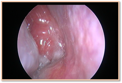 Figure 1 Endoscopic view of enlarged adenoid mass completely filling up and blocking the right choana.